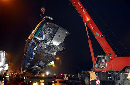 傷者被全部送走后,警察開始指揮吊車和清障車清理現(xiàn)場。晚9時50分,旅行車被吊上清障車拉走,晚10時15分,大客車被吊上另一輛大型清障車。記者晚上10時30分離開時,警察還在對現(xiàn)場進行勘查。