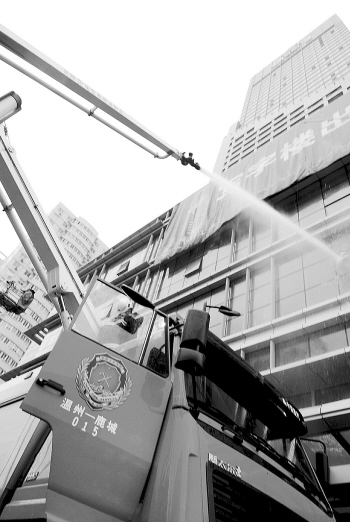 據(jù)了解,華盟商務(wù)廣場高168米,總共45層,是我市目前已建成使用的第一高樓。在昨天的演習(xí)中,消防人員把著火層設(shè)定在21層。下午3點(diǎn)45分,只見大廈21層的幾個(gè)窗口冒出滾滾濃煙,消防部門接警后,先后出動(dòng)下呂浦中隊(duì)、特勤一中隊(duì)、牛山中隊(duì)、特勤二中隊(duì)等四個(gè)消防中隊(duì),80多人和15輛消防車。為了實(shí)現(xiàn)高空滅火和救援,35米的登高平臺車、52米高的云梯車及高噴車先后登場。記者了解到,這些參演的消防車輛價(jià)值不菲,52米的云梯車價(jià)值600多萬元,德國進(jìn)口的35米的登高平臺車價(jià)值300多萬元,美國進(jìn)口的大力搶險(xiǎn)救援車價(jià)值500多萬元。